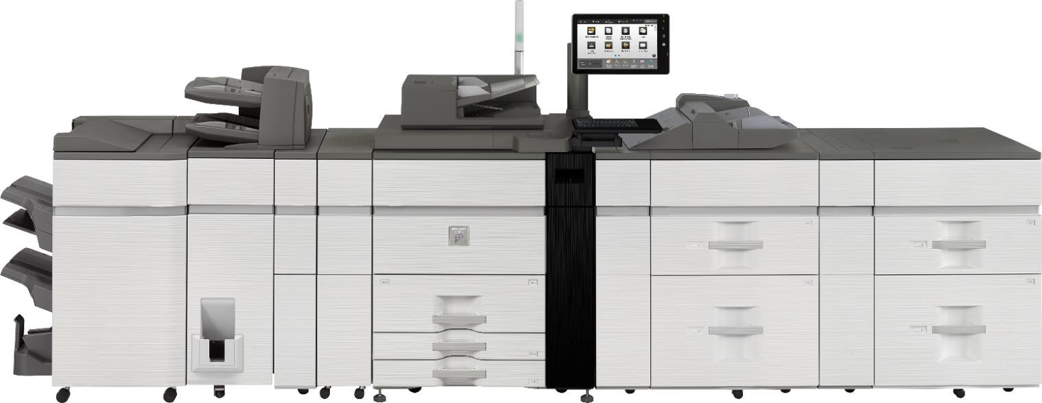 SHARP’s MX-M1206/M1056 mono multifunction printer stands as a cutting-edge document solution, incorporating the latest technology to facilitate high-speed printing and ensure reliable performance. The new series offers impressive print and copy speeds of up to 120/105 PPM, along with a 300-sheet DSPF (Duplex Single Pass Feeder) and a fast scan speed of 240 opm (duplex), enabling efficient scanning operations. In addition, the monochrome MFP comes equipped with large paper trays that can hold up to 13,500 pages. This ample paper storage ensures uninterrupted printing for high-volume jobs, reducing the need for constant paper replenishment. The MX- M1206/M1056 houses a 1TB hard drive and 6 GB of standard memory, transforming it into a high-volume workhorse capable of delivering super-efficient performance. Furthermore, the MFP is built for durability and easy maintenance with a full front access to all key components ensuring easy maintenance and maximum uptime.